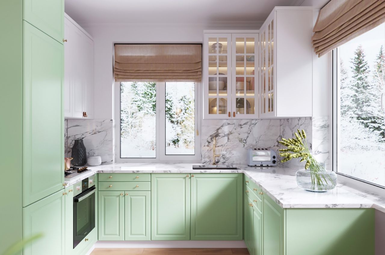Tủ bếp màu xanh bơ mang lại không gian bếp ấm cúng và gần gũi hơn. Đây là màu sắc mềm mại, dễ chịu, rất phù hợp với những căn bếp nhỏ và muốn tạo cảm giác rộng rãi.