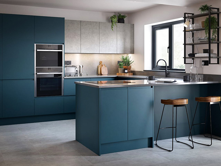 Sử dụng tủ bếp màu xanh cổ vịt sẽ mang đến một phong cách mạnh mẽ và cá tính cho không gian. Bên cạnh đó, bạn cũng có thể kết hợp với những chi tiết trang trí màu vàng hay đồng để tạo ra sự tương phản nổi bật, giúp căn bếp trở nên ấn tượng hơn.