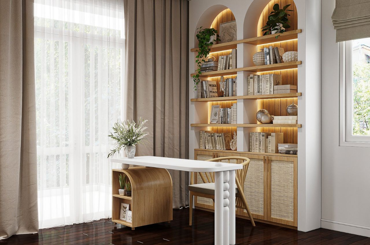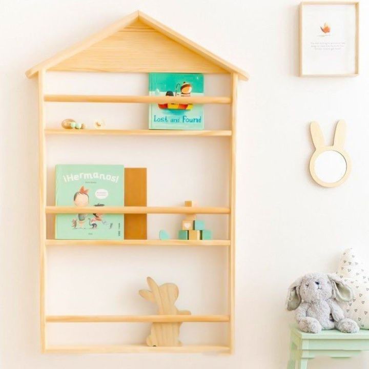 Kệ hình ngôi nhà mang lại cảm giác thân thiện, ấm cúng như chính tổ ấm của bạn. Thiết kế này vừa dễ thương, vừa sáng tạo, làm nổi bật tính cách trẻ trung và ham học hỏi của gia chủ. Không chỉ là nơi để trưng bày đồ trang trí, nó còn tạo ra một không gian kể chuyện, kể về những ký ức đẹp hoặc sở thích cá nhân.