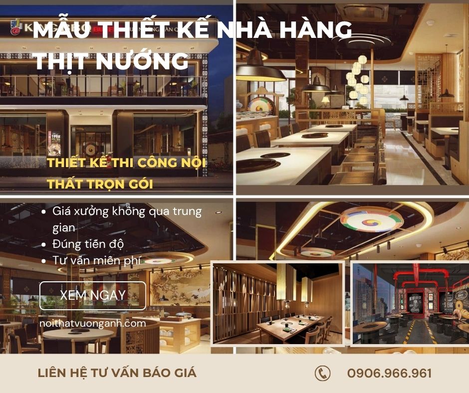 Mẫu thiết kế nhà hàng thịt nướng độc đáo không chỉ là yếu tố thu hút khách hàng mà còn là trái tim của trải nghiệm ẩm thực. Qua việc hiểu rõ các lợi ích của việc thiết kế, các phong cách khác nhau, cũng như chú trọng đến không gian có sẵn, bạn sẽ có thể tạo dựng một không gian ấn tượng và hấp dẫn thực khách. Việc lựa chọn đơn vị thiết kế thi công uy tín như Nội Thất Vương Anh sẽ giúp bạn hiện thực hóa những ý tưởng sáng tạo của mình một cách hiệu quả và chuyên nghiệp nhất.