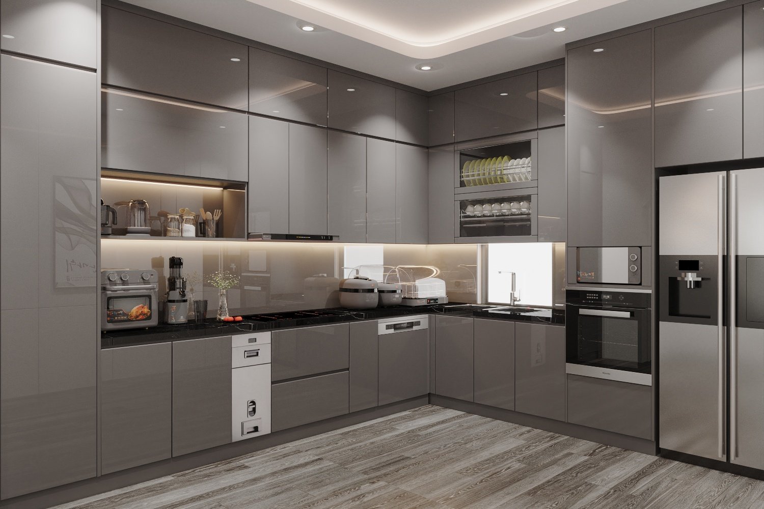 Khi nói đến thiết kế phòng bếp màu xám sang trọng, có rất nhiều phong cách để bạn lựa chọn. Một trong những mẫu được yêu thích nhất hiện nay là thiết kế tủ bếp với cửa tủ màu xám bóng bẩy kết hợp với mặt bàn đá tự nhiên. Hãy thử tưởng tượng một không gian bếp với ánh sáng vàng nhẹ bằng cách sử dụng những ánh đèn led âm trần, chắc chắn sẽ làm cho bếp của bạn thêm sang trọng và đẳng cấp hơn.