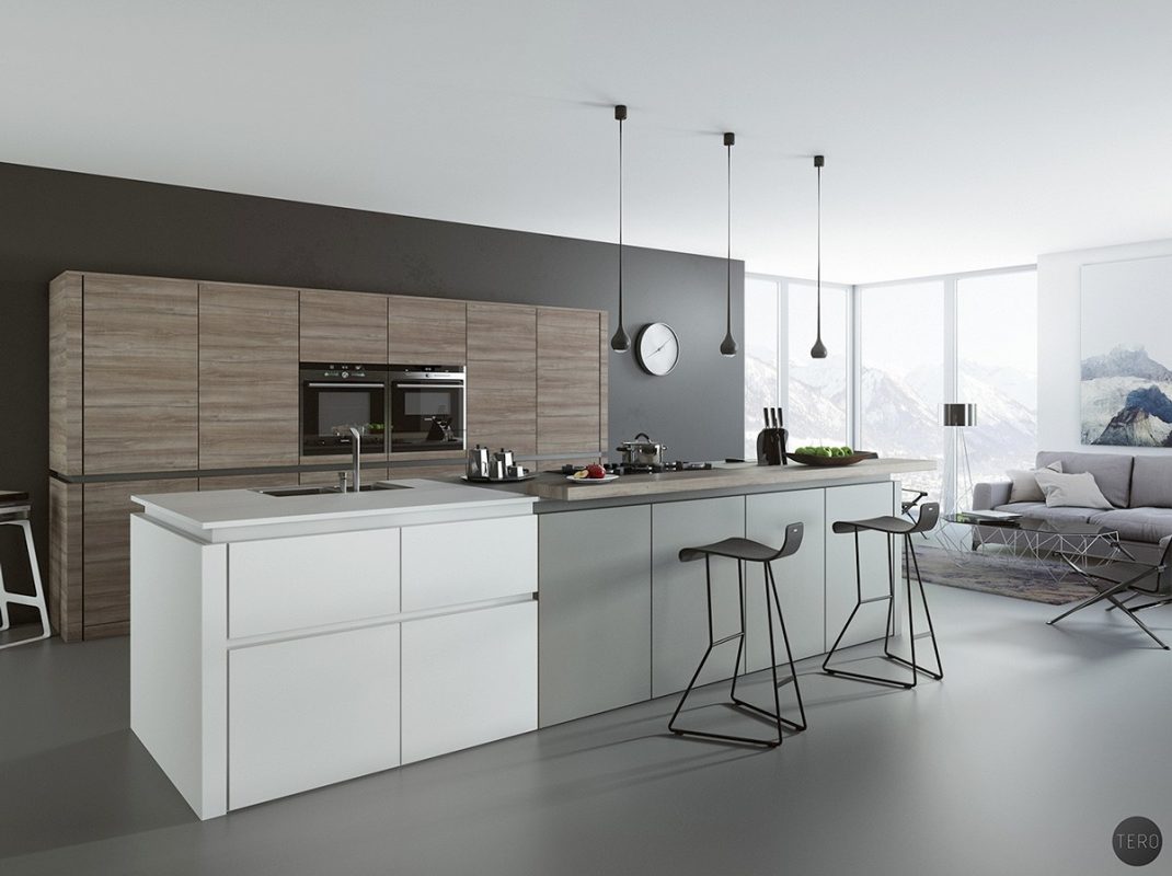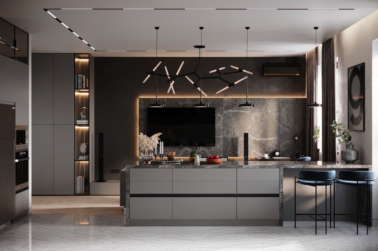 Ngoài ra, bạn cũng có thể thử sức với những mẫu thiết kế hiện đại bằng cách sử dụng đảo bếp màu xám làm trung tâm. Kết hợp với ghế bar màu trắng hoặc đen sẽ tạo sự tương phản hoàn hảo, góp phần tăng thêm sự thanh lịch cho không gian bếp của bạn.