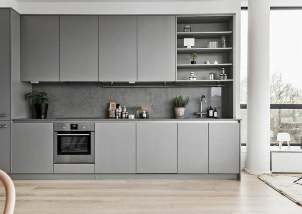 Hơn nữa, màu xám còn giúp làm nổi bật các vật liệu tự nhiên như gỗ và đá. Bạn có thể thiết kế tủ bếp bằng chất liệu gỗ có vân đẹp, kết hợp với bề mặt đá cẩm thạch màu xám nhạt. Điều này không chỉ tạo ra nét đẹp hiện đại mà còn mang đến cảm giác gần gũi với thiên nhiên cho không gian bếp của bạn.