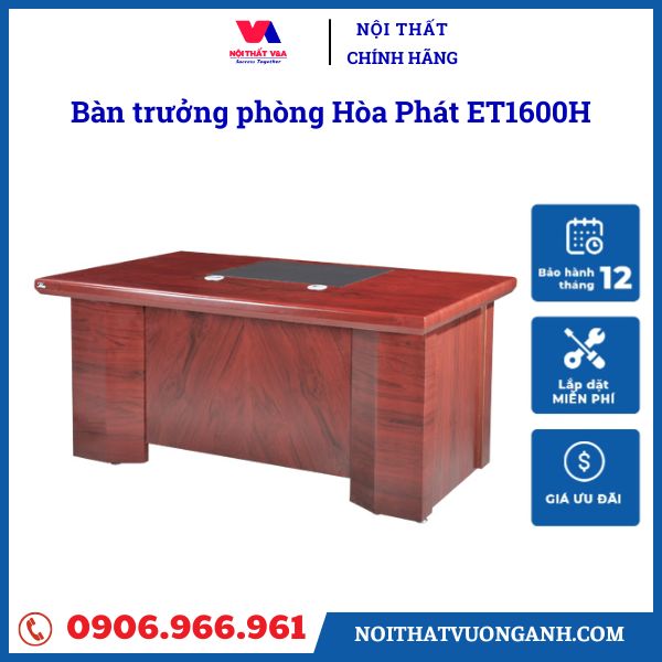 Với thiết kế hiện đại, tính năng tiện ích, và chất liệu bền bỉ, bàn trưởng phòng Hòa Phát ET1600H là sự lựa chọn lý tưởng cho không gian làm việc lãnh đạo. Từ kiểu dáng sang trọng đến dịch vụ chăm sóc khách hàng tận tâm, sản phẩm này không chỉ đơn thuần là một món nội thất mà còn mang lại giá trị thực sự cho người sử dụng. Nội Thất Vương Anh tự hào là đơn vị cung cấp sản phẩm này cùng nhiều sản phẩm khác, giúp tạo nên không gian làm việc hoàn hảo cho mọi đơn vị.