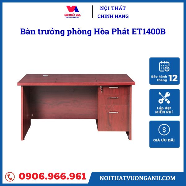 Bàn trưởng phòng Hòa Phát ET1400B không chỉ mang đến vẻ đẹp sang trọng và hiện đại cho không gian văn phòng mà còn đáp ứng đầy đủ nhu cầu làm việc của người dùng. Với thiết kế thông minh, chất liệu cao cấp và sự tiện lợi trong sử dụng, sản phẩm này xứng đáng là lựa chọn hàng đầu cho các trưởng phòng cũng như các không gian làm việc chuyên nghiệp. Nếu bạn đang tìm kiếm một bàn làm việc chất lượng, hãy đến với Nội thất Vương Anh để trải nghiệm sản phẩm tốt nhất và dịch vụ tận tình nhất.